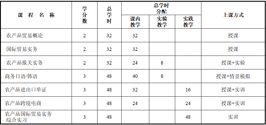 本微专业旨在培养德智体美劳全面发展,掌握农产品国际贸易基本理论与技术,具备以英语开展农产品国际贸易业务,以日语/韩语辅助商务沟通,且独立处理农产品进出口全流程实务能力的复合应用型人才。学生通过系统学习,能够独立完成农产品国际贸易业务对接、进出口单证制作、报关申报及跨境电商基础运营,理解跨境农产品国际贸易的行业法规、商业伦理及日韩市场准入规范。毕业生具备良好的团队协作、跨文化沟通和持续学习能力,能够在对日/对韩农产品出口企业、涉农外贸服务机构等相关领域从事贸易业务操作、报关单证处理、跨境电商运营等工作,或为进一步深造打下基础。