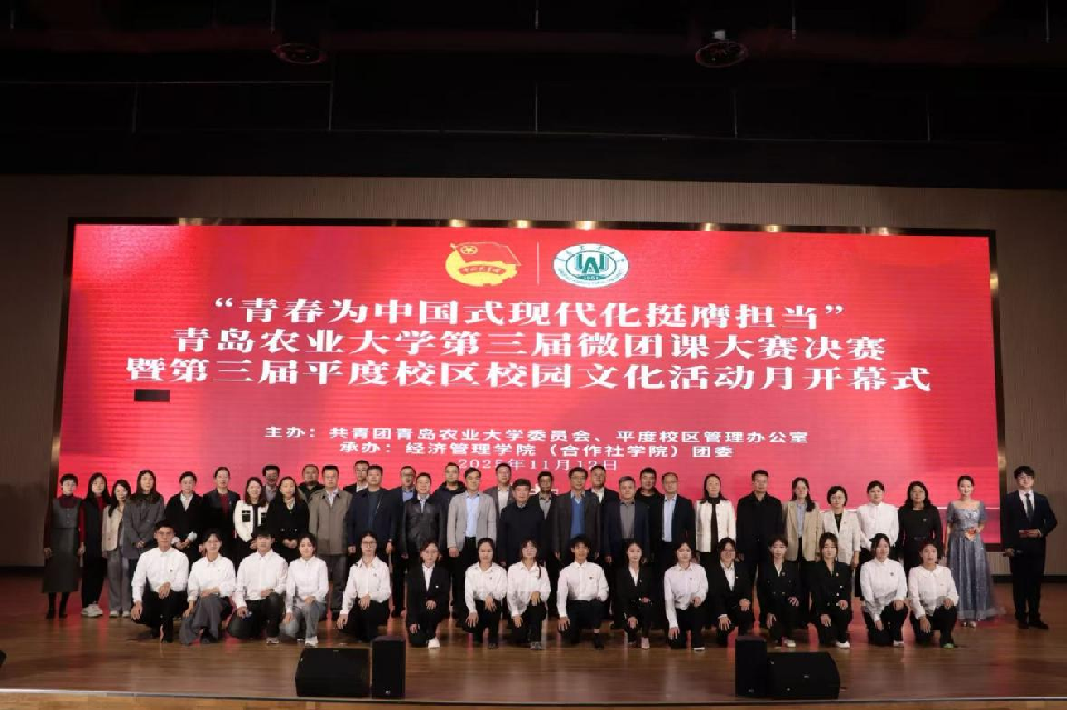 11 月 12日,“青春为中国式现代化挺膺担当”青岛农业大学第三届微团课大赛决赛暨第三届平度校区校园文化活动月开幕式在平度校区大学生创业中心报告厅顺利举行。本次活动由校团委、平度校区管理办公室主办,经济管理学院(合作社学院)团委承办,校党委副书记田义轲,学生工作处处长杨凯,平度校区党委副书记、平度校区管理办公室主任王国辉,巴瑟斯未来农业科技学院党委书记王光炬,经济管理学院(合作社学院)党委书记张德锋,校党委宣传部副部长王政军,平度校区管理办公室副主任姜鲁平,马克思主义学院副院长纪咏梅,校团委副书记、创新创业学院副院长嵇安奕,校团委副书记安金鹏和各学院团委书记出席活动,2025级全体新生班班长、团支部书记共600余名师生参加。