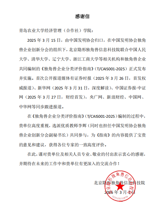 3月1日,中国发明协会独角兽企业创新分会、北京隐形独角兽信息科技院向经济管理学院(合作社学院)致感谢信,对学院选派李辉老师参与编制《独角兽企业分类评价指南》表示感谢,并给予高度评价。