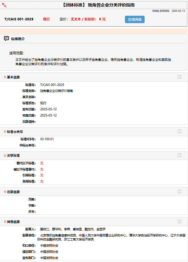 2025年3月15日,由中国发明协会归口,在中国发明协会独角兽企业创新分会的组织下,北京隐形独角兽信息科技院联合中国人民大学、清华大学及我校等共同编制的《独角兽企业分类评价指南》(T/CAIS 001—2025)正式发布并实施。这是全球首个系统性的独角兽企业分类评价标准,首次构建了“种子独角兽—隐形独角兽—标准独角兽—超级独角兽”的四级分类体系,破除“唯估值论”,引导企业聚焦核心技术攻关。
