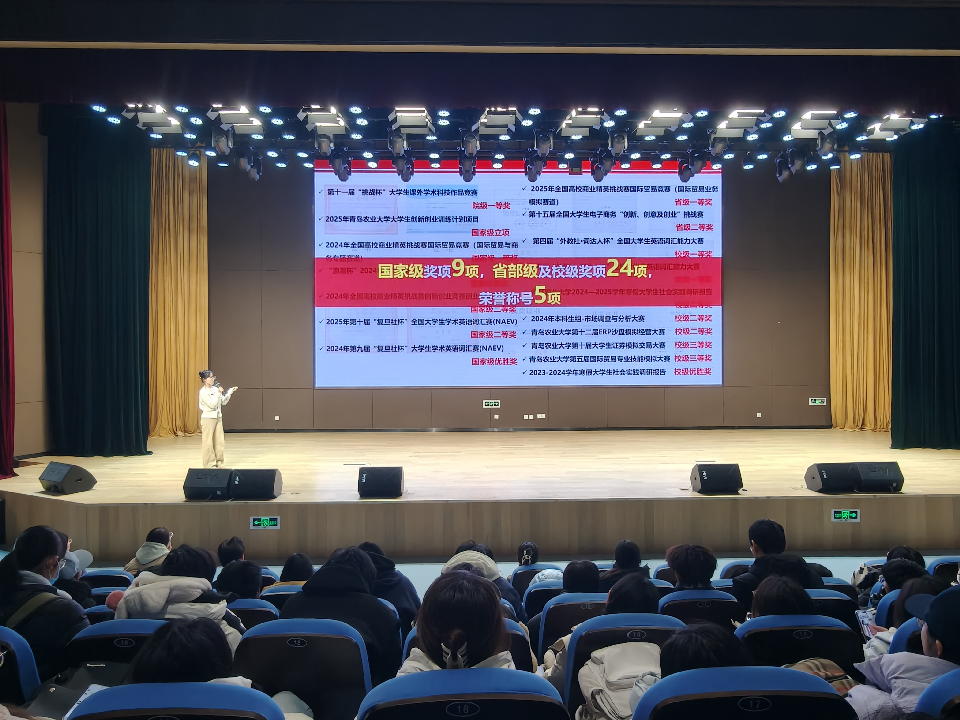 为进一步助力学生明晰就业方向、把握创新创业机遇,提升创新创业综合能力,12月18日,经济管理学院(合作社学院)在平度校区大学生活动中心报告厅召开“解锁双创新赛道·点亮青春就业路——大学生创新创业与就业规划”专题宣讲会。宣讲会由学院副科级辅导员齐潇主持,学院辅导员及2025级学生参加。学院优秀学生代表受邀担任主讲人,为在场学子开展就业创业经验分享。