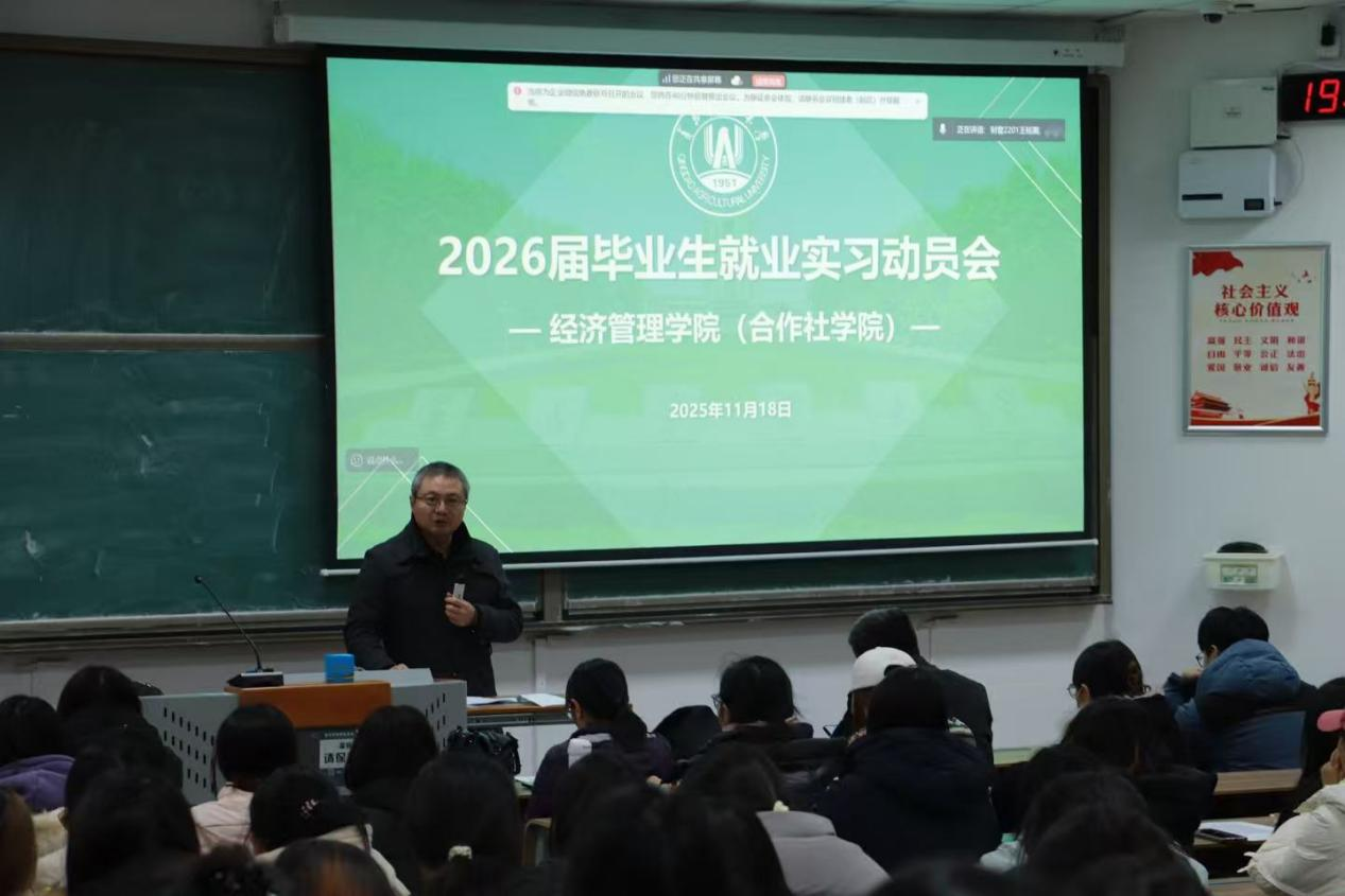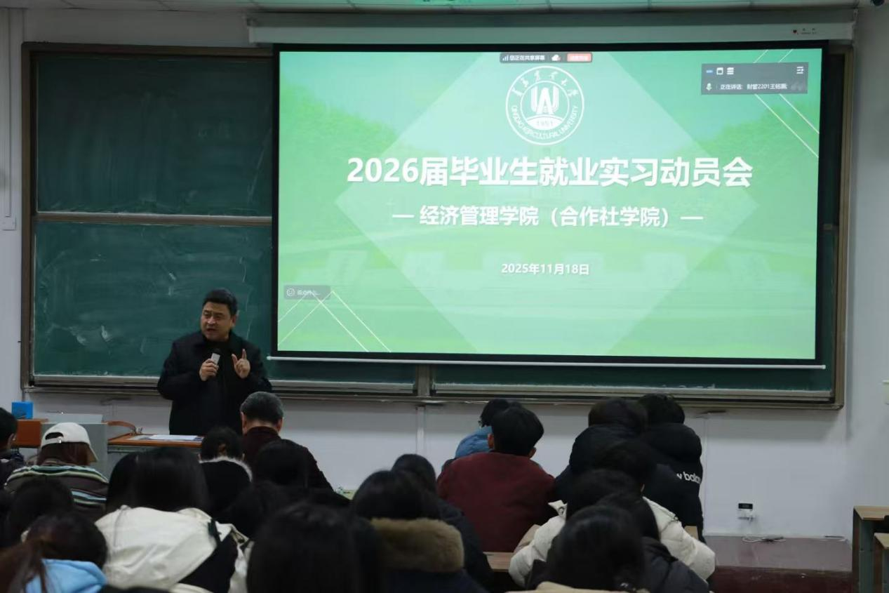 2025年11月19日,经济管理学院(合作社学院)召开2026届毕业生就业实习动员会,学院党委副书记、副院长孙昭锋,副院长孙兆明,团委书记孙杰,各系系主任,毕业生带班辅导员和2026届全体毕业生参会。