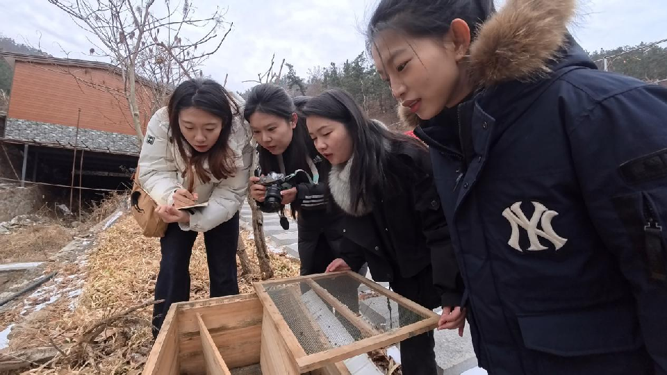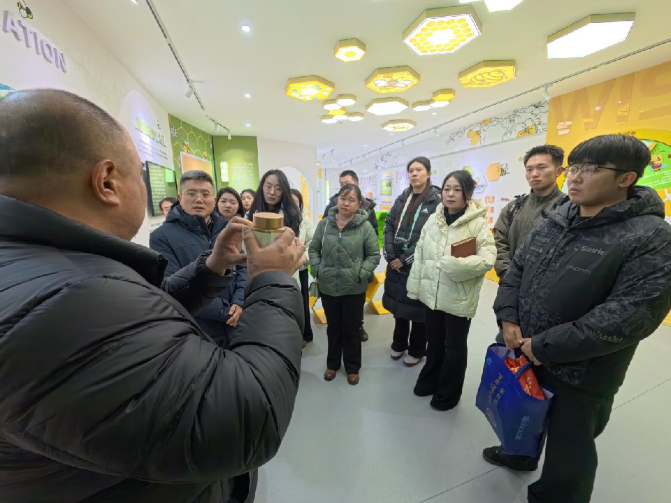 在中华蜜蜂产业园,孙新昌主任详细讲解了村庄蜜蜂养殖的悠久历史与现代化发展历程。从本土中华蜜蜂的驯化繁育、智能蜂箱的应用管理,到蜂产品加工、研学项目开发,实践团全面了解了这一“甜蜜产业”如何串联起生态保护、产业增收与乡村旅游。据介绍,该村依托中华蜜蜂保种场,已形成集良种育繁、授粉应用、科普研学于一体的完整产业链,为村集体与农户增收提供了坚实支撑,这让师生们对乡村特色产业振兴有了更直观的认知。