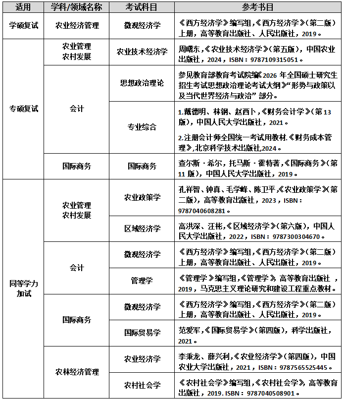 经济管理学院(合作社学院)研究生复试及同等学力加试参考书目